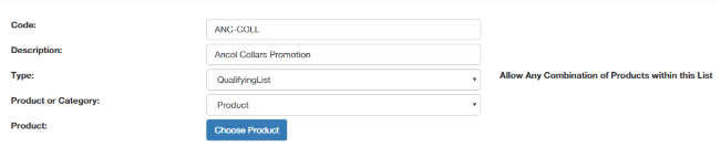 8) In the Product Qualifying List, Press Lookup for Qualifying List 1 and find your Collar promotion. Set Number of Matches to 1.