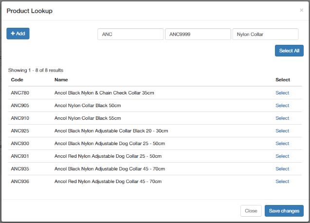 7) To filter Products, First add the product code range In the "From Code" and "to Code" boxes. for example, Entering from "ANC" to "ANC9999" will filter the products list to show only Ancol products. The "Name OR Description" box can be used to filter these resuilts further. Type "Nylon Collar" to show only nylon collars from Ancol. Press enter to submit your search.