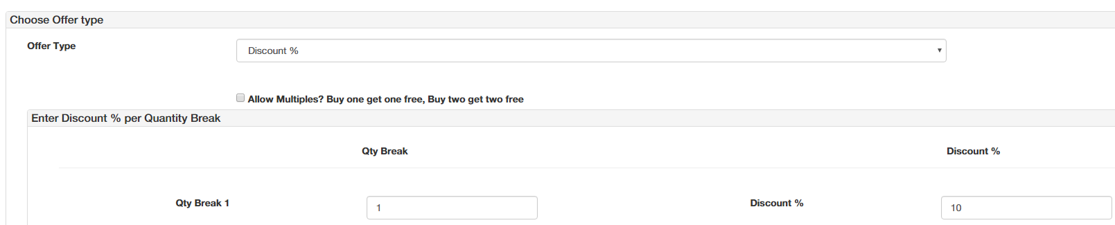 11) In the Choose Offer Type Box, Select Discount %. Allow Multiples must be unchecked, this is for free product promotions.