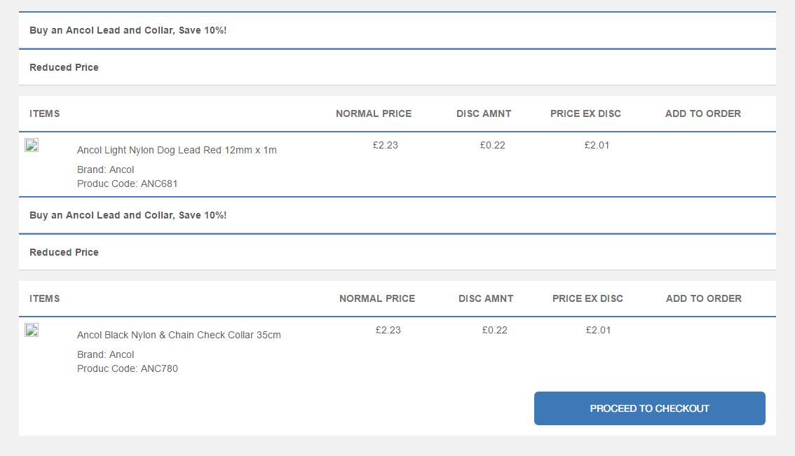 This article will show the procedure of setting up a promotion for when a customer buys 2 items from different lists, they recieve 10% off the products. For this example we will be offering the customer 10% off when they purchase a Dog Lead and Collar.