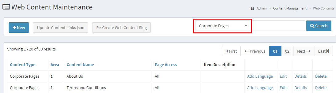 Admin > Content Management > Web Contents