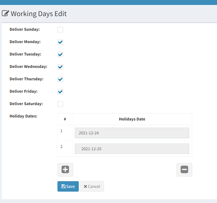 In screenshot below, Saturday and Sunday are delivery holidays, also 2021-12-24 and 2021-12-25 are festival/National holidays. We won't deliver on these days.